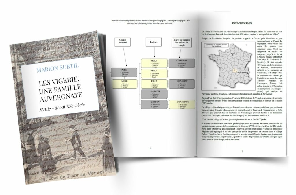 « Les Vigerie, une famille auvergnate. XVIIIe – début XXe siècle ». 120 pages retraçant deux siècles de l’histoire d’une famille auvergnate et d’un patronyme. 8 générations, plus de 50 documents d’archives intégrés (actes, lettres, photos, presse locale…).